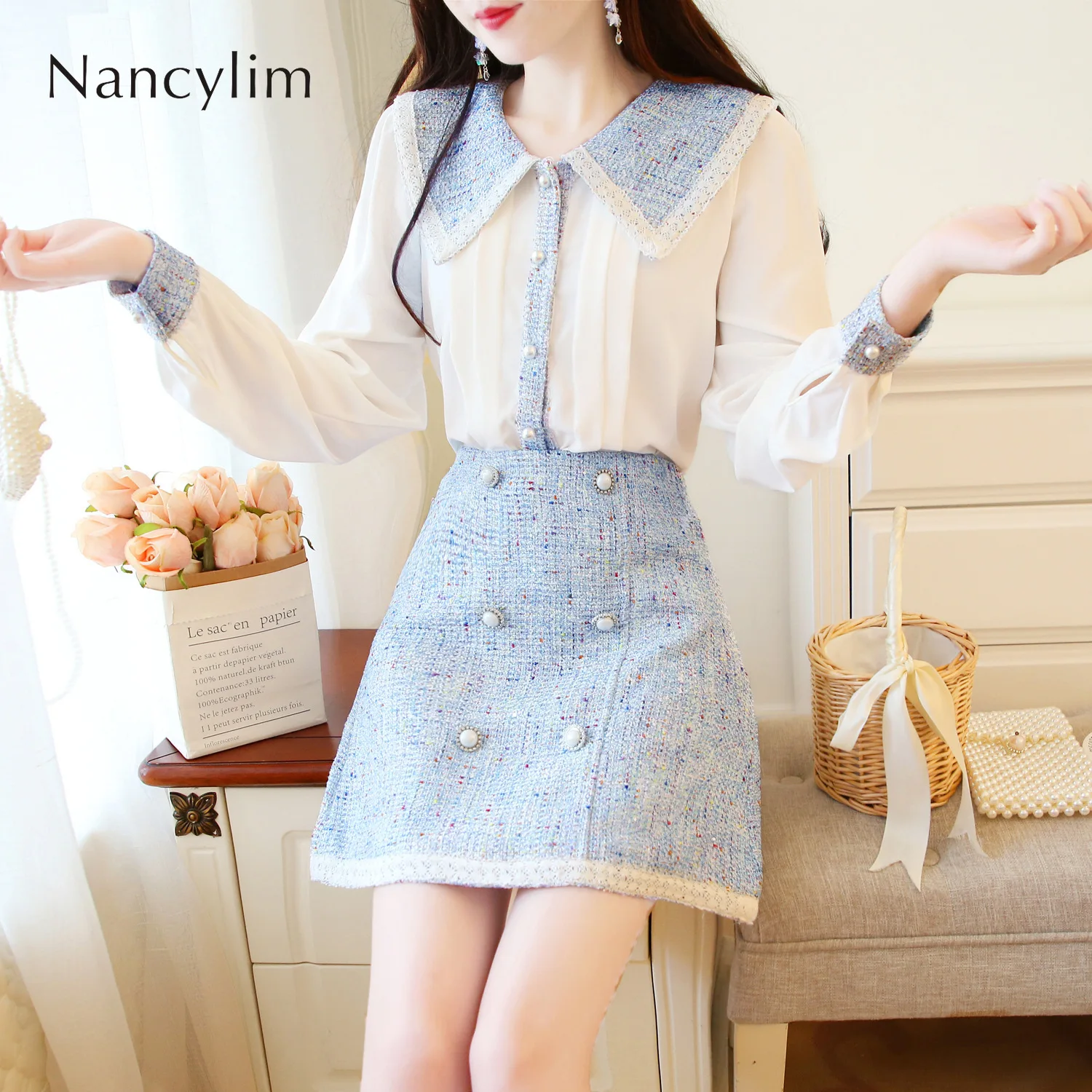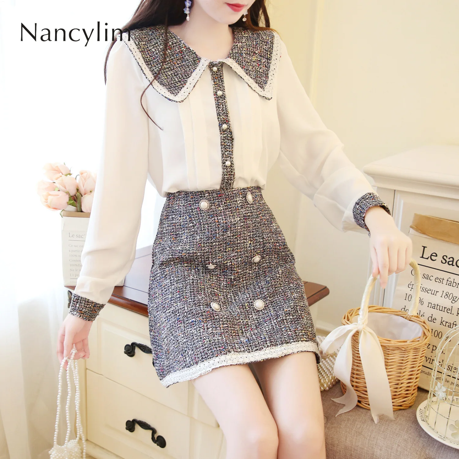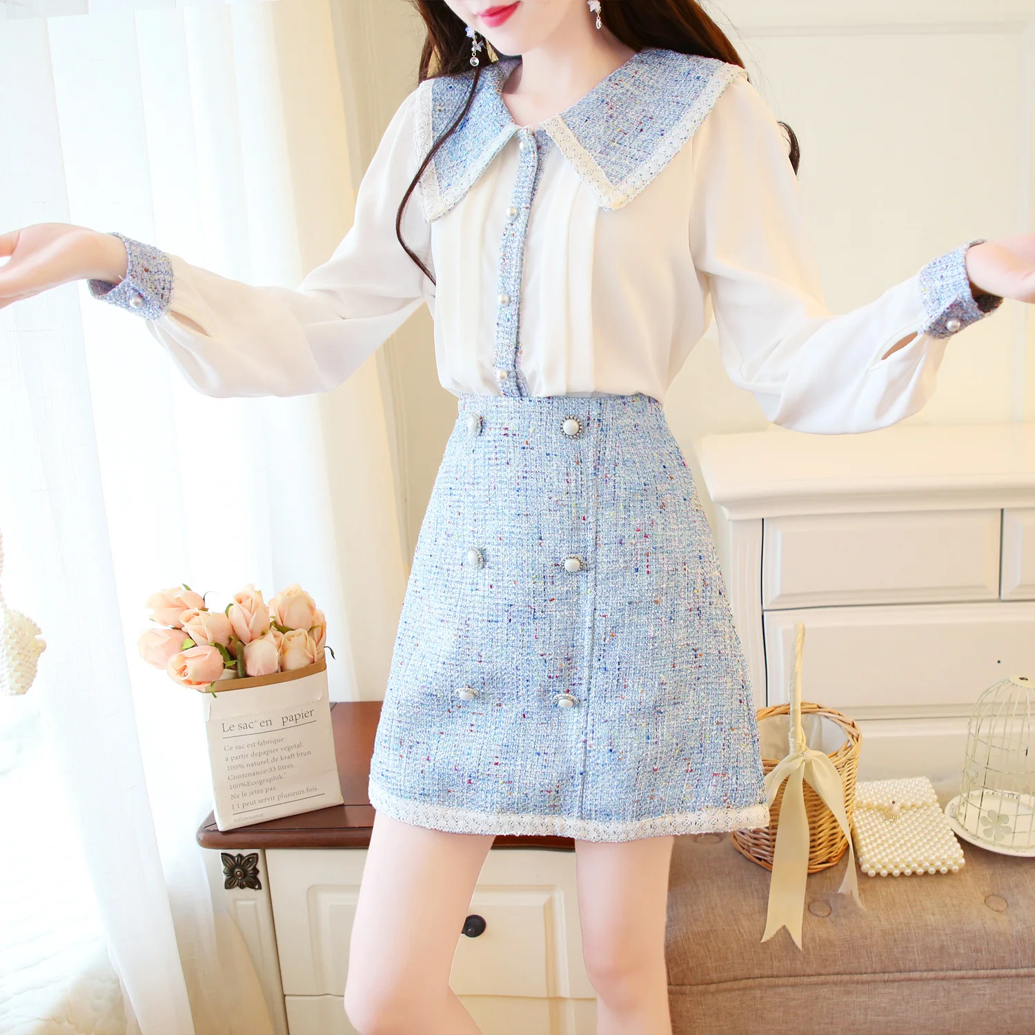 RESPONSE TO "Best Seller 2019 New Breeze Doll Collar Long Sleeve Shirt + Contrast Color Slim A-line Skirt Two-piece Set Autu"